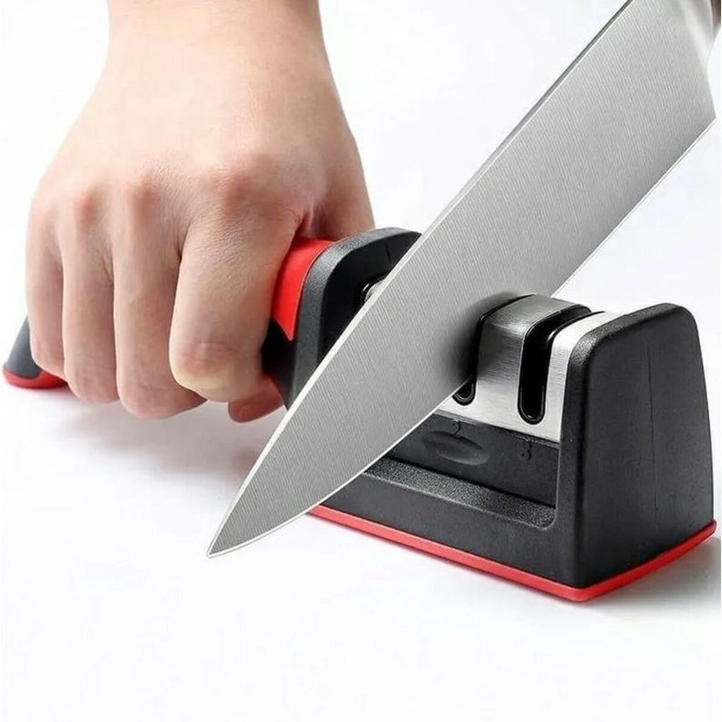 Esse super afiador de facas é indispensável para sua cozinha, sendo SIMPLES e RÁPIDO de usar. Basta dar de 3 a 4 movimentos através do afiador, e pronto! Sua faca como nova!